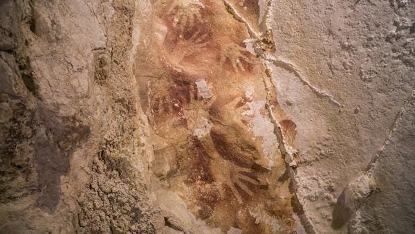 "Scattered on the walls are stencils, human hands outlined against a background of red paint. Though faded, they are stark and evocative, a thrilling message from the distant past... hands are lined up in two horizontal tracks, all with fingers pointing to the left. Elsewhere there are hands with slender, pointed digits possibly created by overlapping one stencil with another; with painted palm lines; and with fingers that are bent or missing."