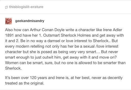 In related reading, my friend sent me this Tumblr post discussion on how Irene Adler was written by Doyle as a character smarter than Sherlock but every modern retelling not only has her be a sexual /love interest character + she’s never able to outsmart him.