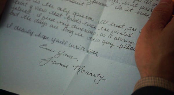 "For a long while now, I’ve suspected that connection with another person, real connection, simply isn’t possible. I’m curious if you disagree, although I suspect you feel as I do in this, as you do in so many other things. So tell me: Is it possible to truly know another person? Is it even a worthwhile pursuit? Yours is the only opinion I’ll trust, the only point of view that holds even the faintest interest. I find my diversions, as I always do, but the days are long in this gray place. I dearly hope you’ll write soon. Ever yours, Jamie Moriarty."