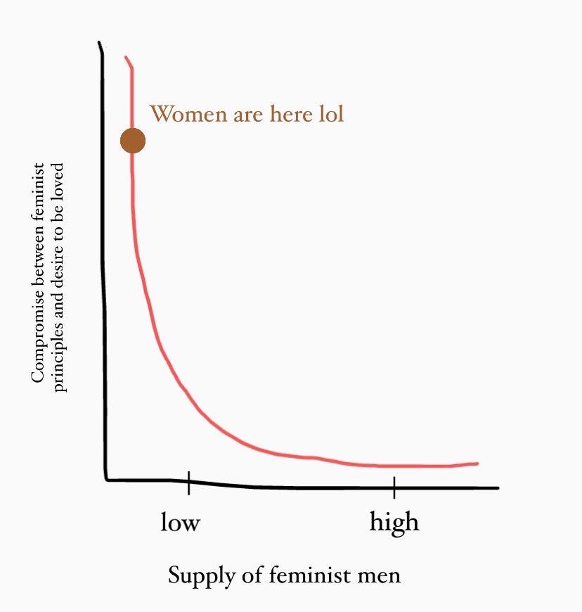 When I brought this conundrum up with my partner, we tried to graph the problem and noticed that heterosexual cosmopolitan women today are stuck between the 'mismatch gap' of high demand/low supply of feminist allyship in the dating pool.