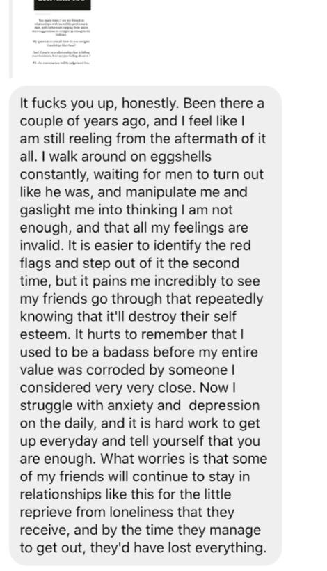 I love the way these stories hold so many aspects of identity: the hypocritical feminist, the indifferent friend, the toxic girlfriend, the cautious-lovesick dater. We see ourselves grapple with the wrongness of our standpoints while reinforcing a belief system that teaches us better. We want to witness the entire spectrum of love even though it's riddled with gendered faults because ultimately, we want to be loved ...we want to be seen.