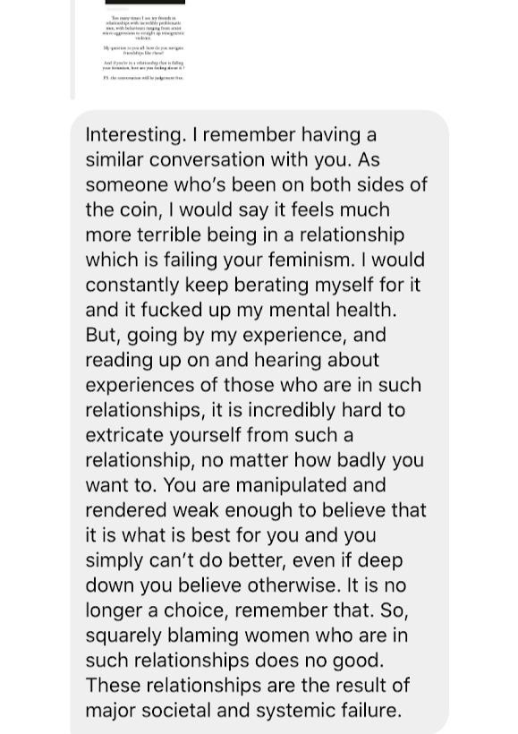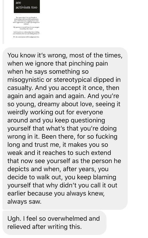 “Am I feminist enough if I tolerate casual misogyny and sexism from my significant other? Am I a pseudo feminist for not being stronger and leaving the person who I disagree with? Or am I simply thinking too much and does it not matter at all?”