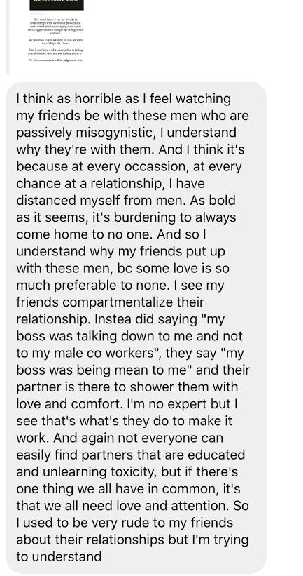 Of course, it's unsurprising that the odds are stacked against us in a patriarchal society- but it is indeed interesting to see how various parts of our identity converge and collide to accommodate this gap. I remember wanting to be my truest self when I was dating around - and the cutting hurt of having to walk away from bad dates because something sexist was said or done. Why, when I was matching my principles, and living my beliefs, was the ride home spent crying? Why was I trying to be a good feminist and an emotionally full-filled woman, knowing I could never truly be either?