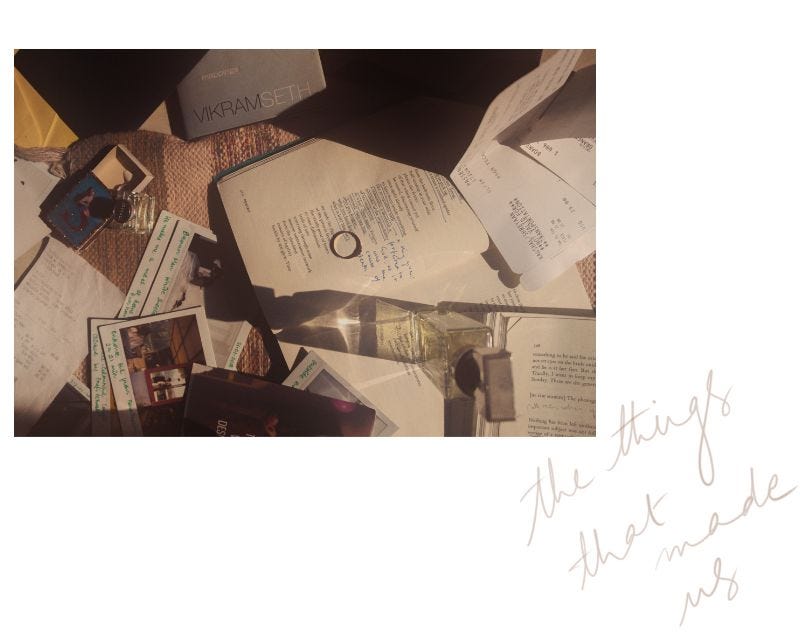 They lay conjured on the ground- blue and yellow envelopes, restaurant receipts with ink lightening into paper, and dusty polaroids. They lie patiently, like they were made for a vision, a ballad. My bedroom floor became a museum for the decade we made, and the things that made us.
